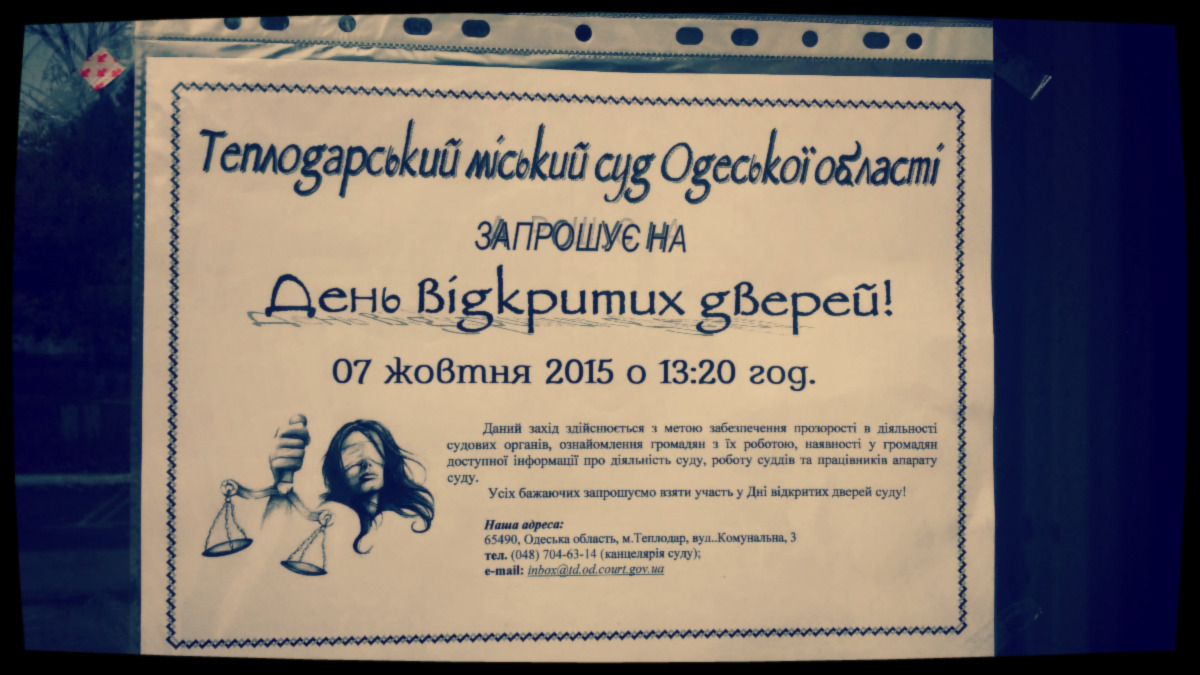 З метою популяризації, підвищення прозорості в діяльності Теплодарського міського суду Одеської області та ознайомлення молоді з роботою та загалом з судовою системою , 07 жовтня 2015 року був проведений «День Відкритих Дверей» для громадян та учнів Теплодарської ЗОШ № 1.
