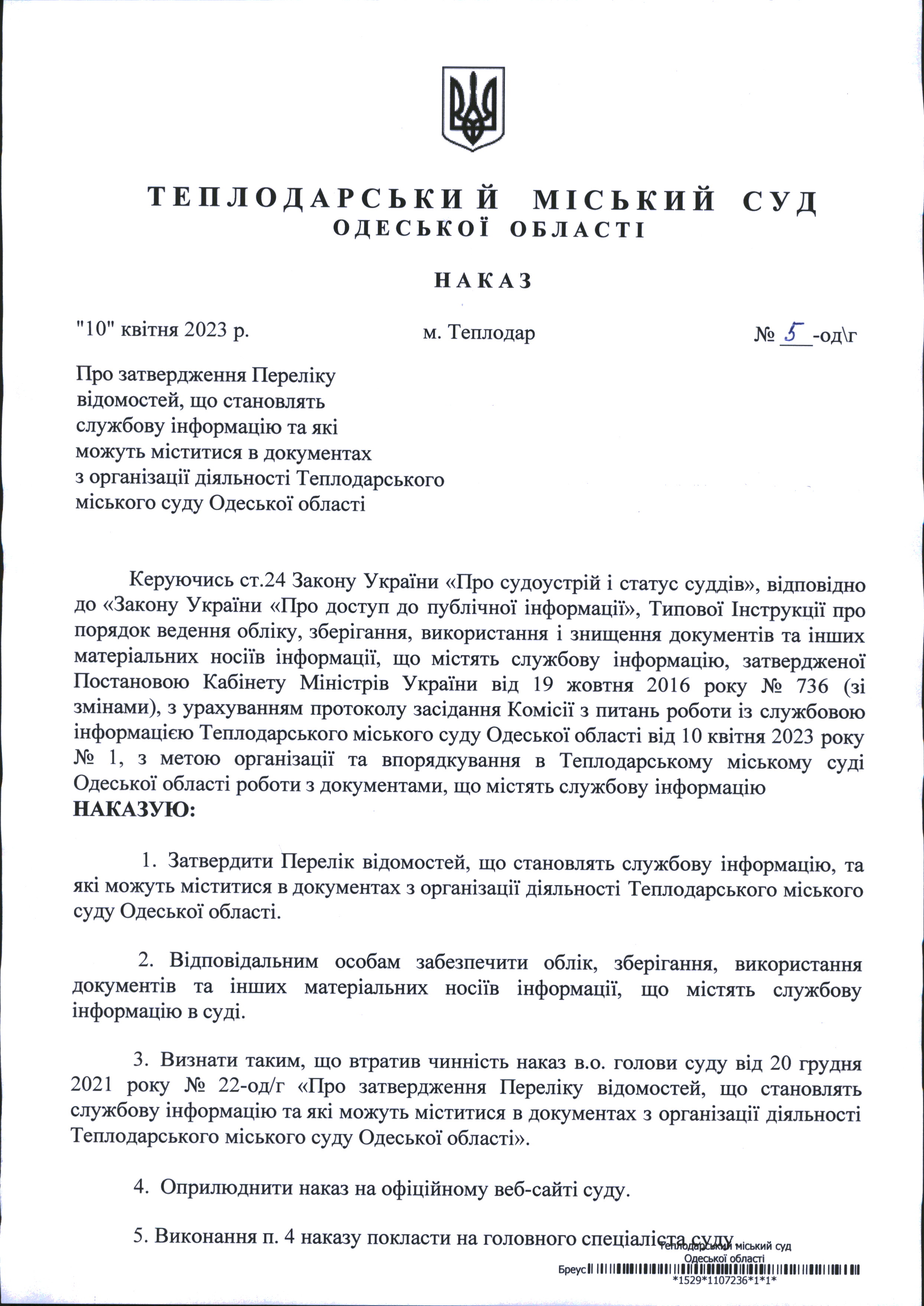 Наказ від 03.12.2025 №30-од/г "Про внесення змін до Переліку відомостей, що становлять службову інформацію та які можуть міститися в документах з організації діяльності Теплодарського міського суду Одеської області"