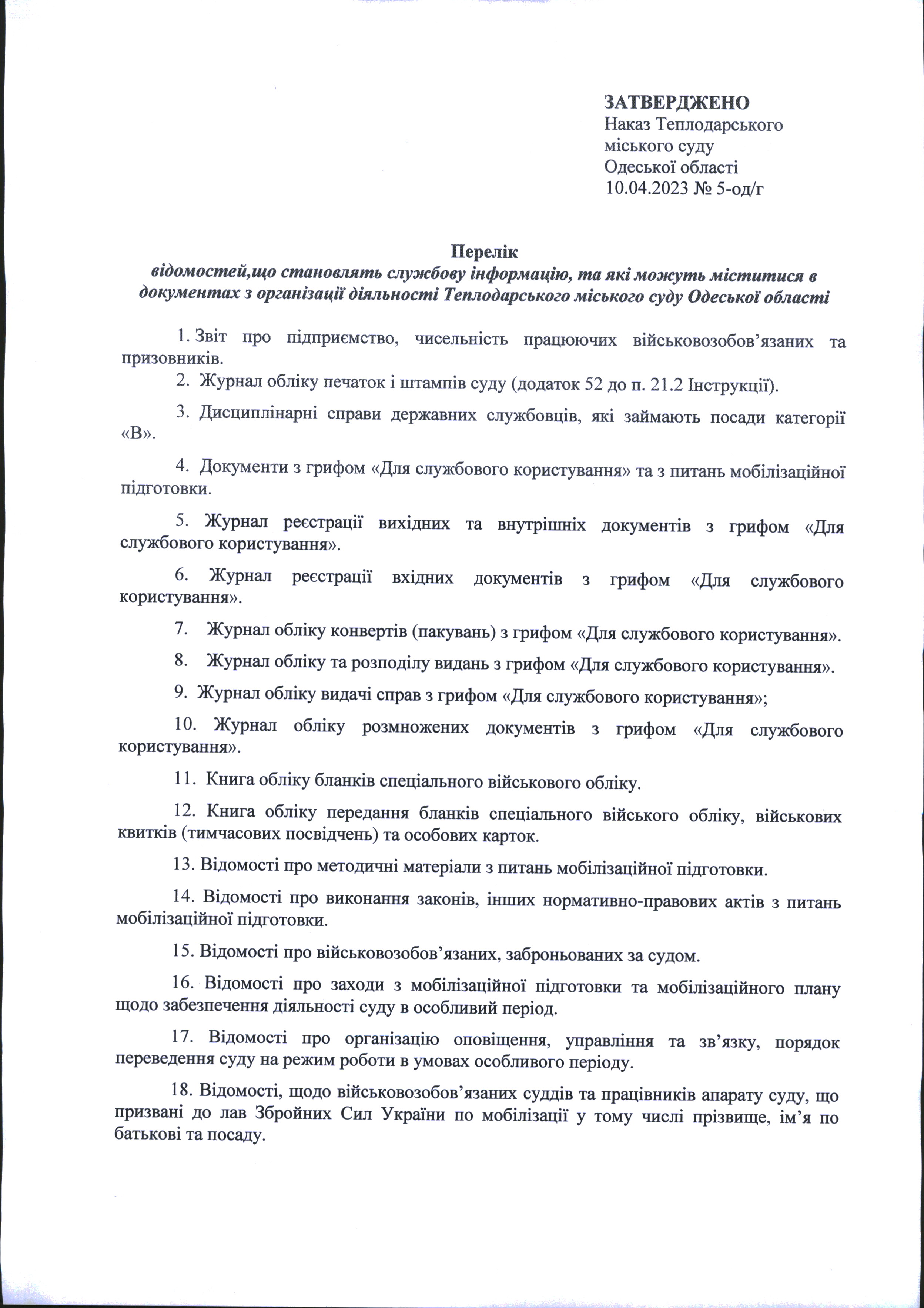 Наказ від 17.11.2025 №27-од/г "Про внесення змін до Переліку відомостей, що становлять службову інформацію та які можуть міститися в документах з організації діяльності Теплодарського міського суду Одеської області".