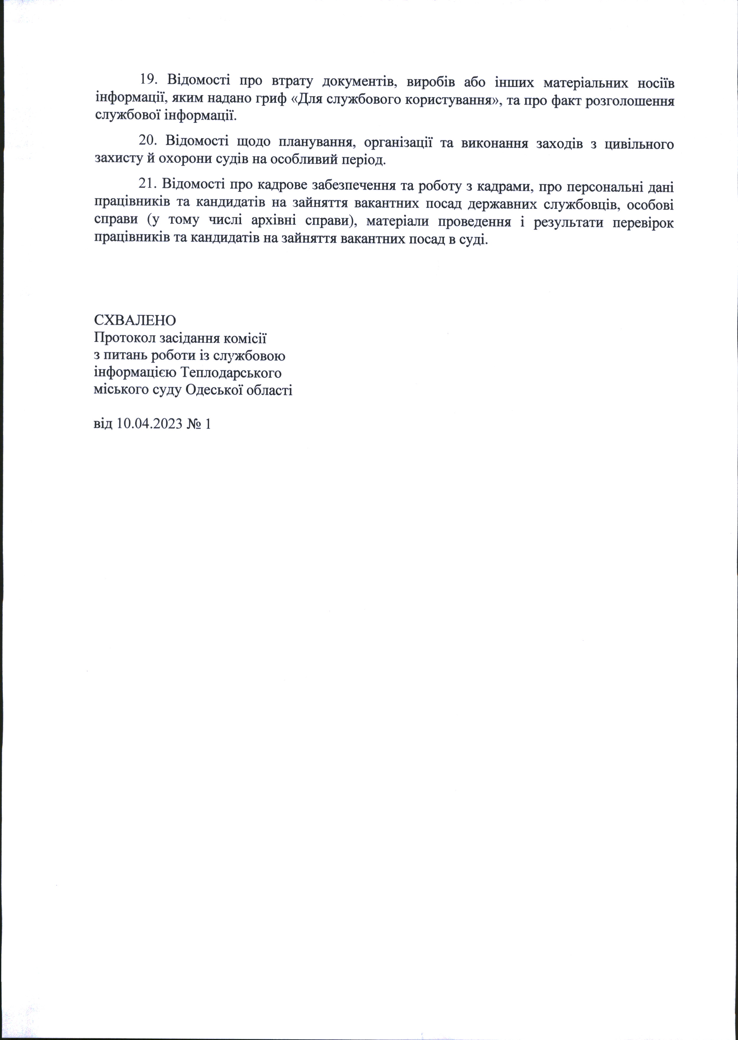 Наказ та Перелік затверджених наказом голови суду документів, що містять службову інформацію та які можуть міститися в документах з організації діяльності суду